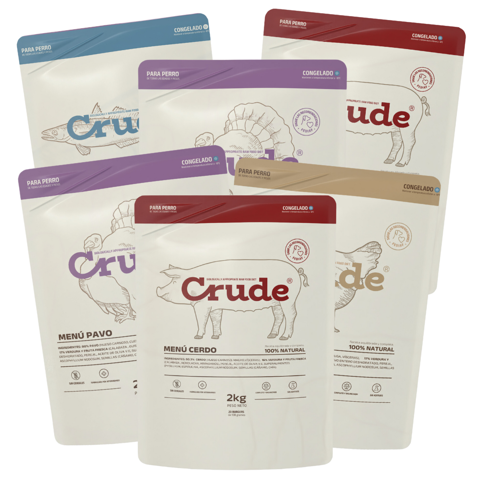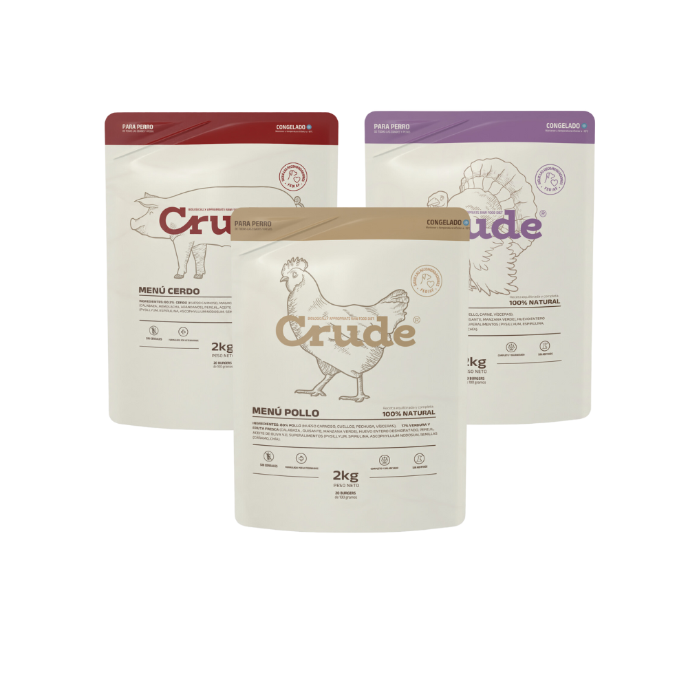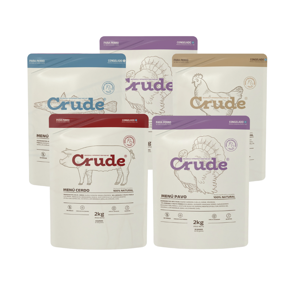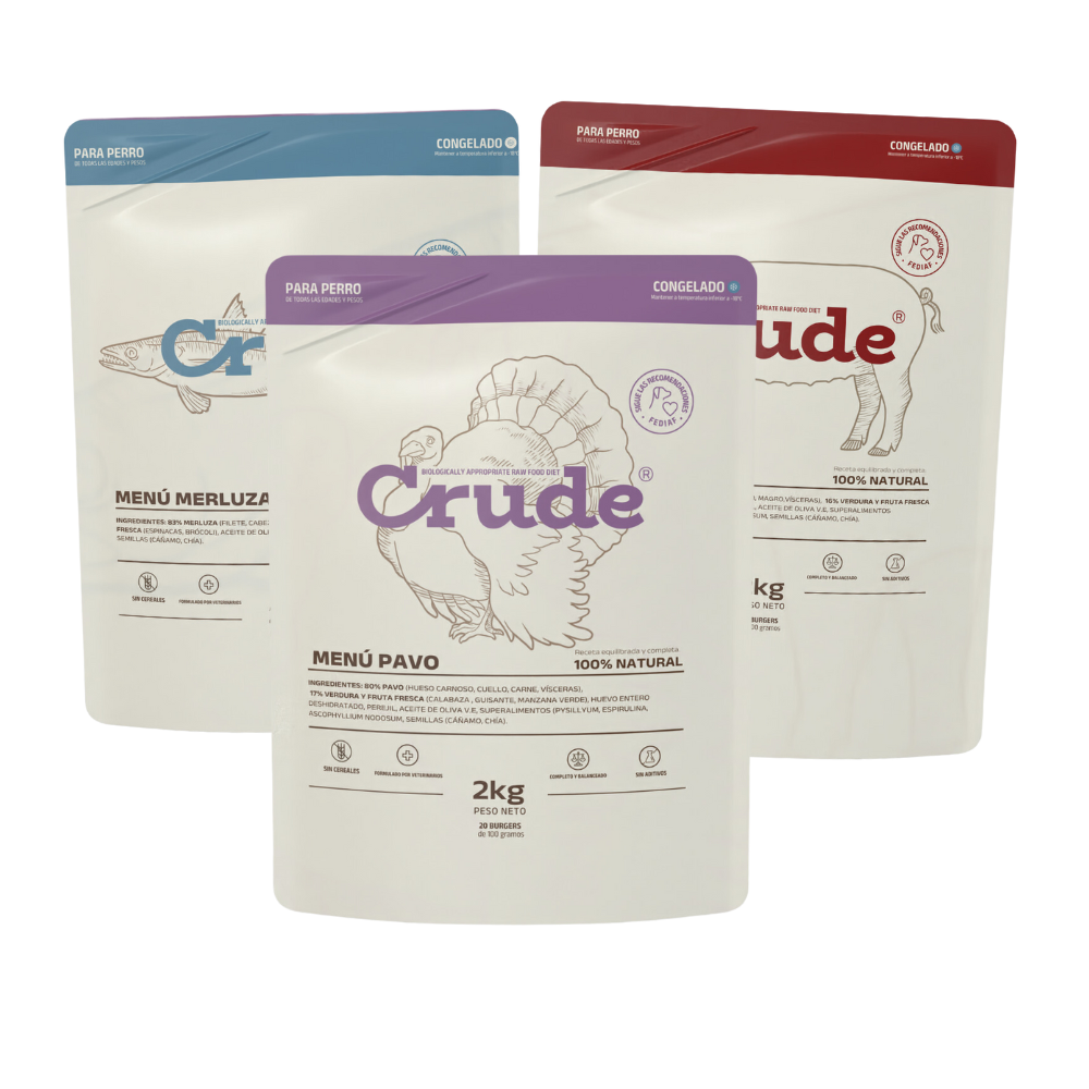Incluye 6 bolsas de 2 kg: 2 de Pavo con calabaza y manzana, 2 de Pollo con calabaza y guisantes, y 2 de Cerdo con remolacha y arándanos. Además, obtienes asesoría nutricional gratuita, guía de iniciación y envío premium en nevera retornable.