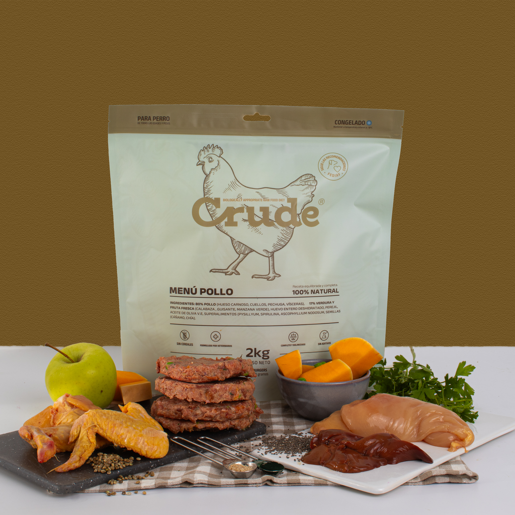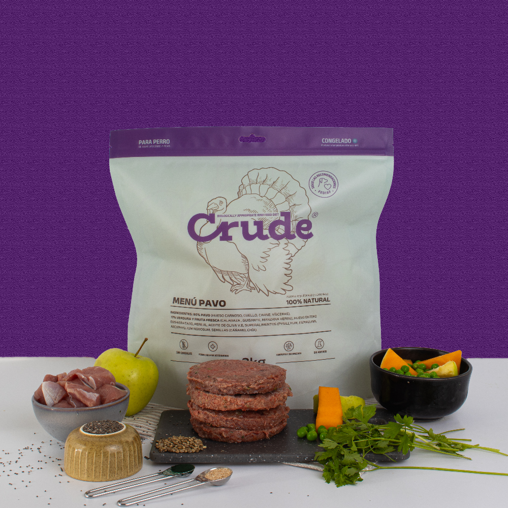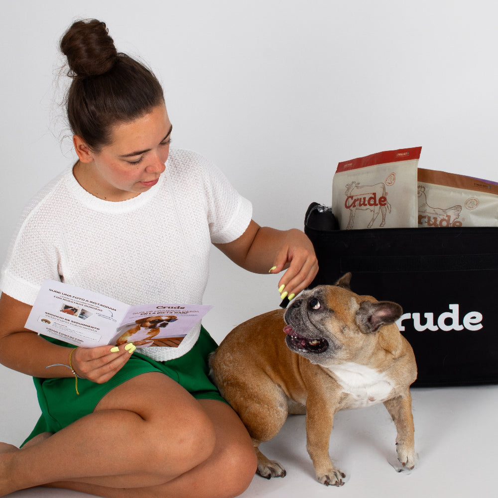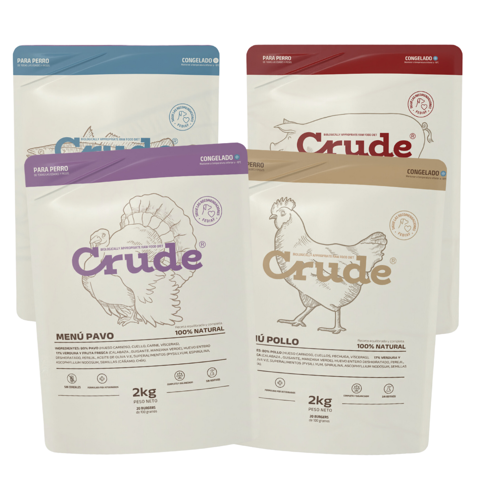 Incluye 6 bolsas de 2 kg: 2 de Pavo con calabaza y manzana, 2 de Pollo con calabaza y guisantes, y 2 de Cerdo con remolacha y arándanos. Además, obtienes asesoría nutricional gratuita, guía de iniciación y envío premium en nevera retornable.